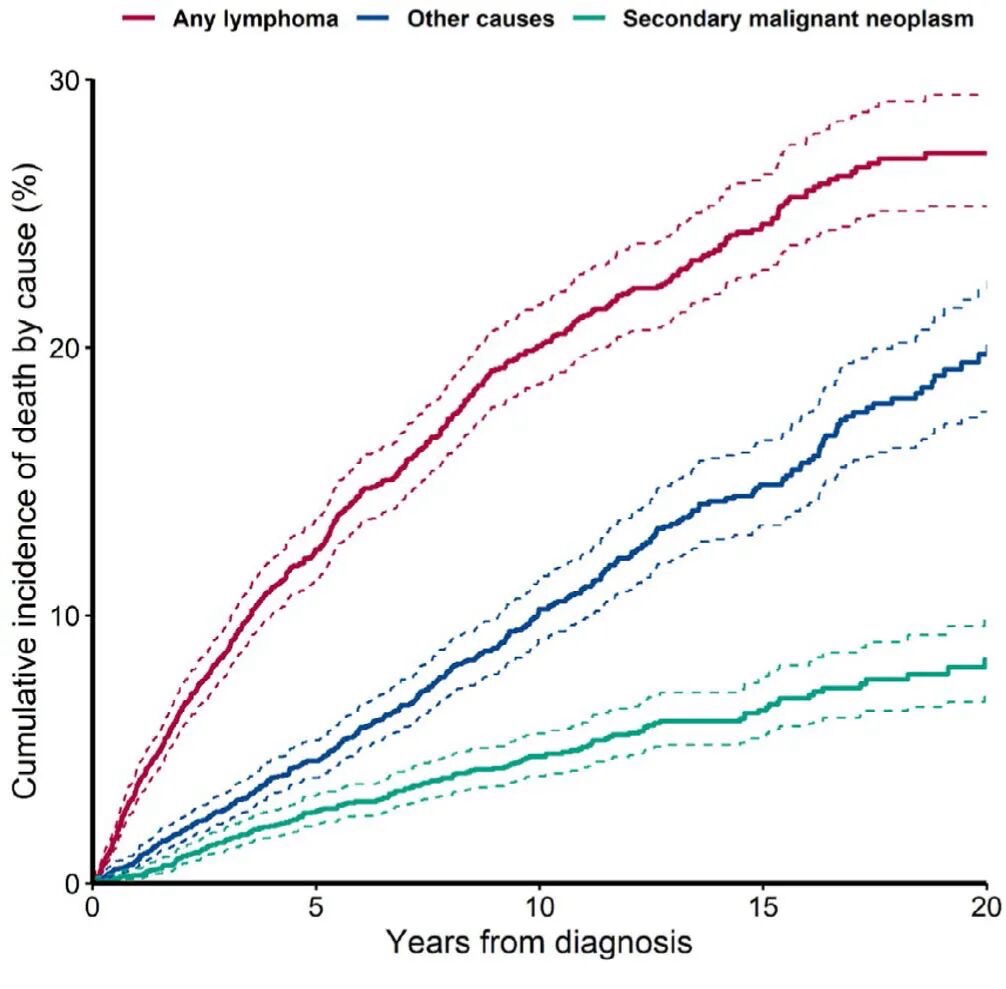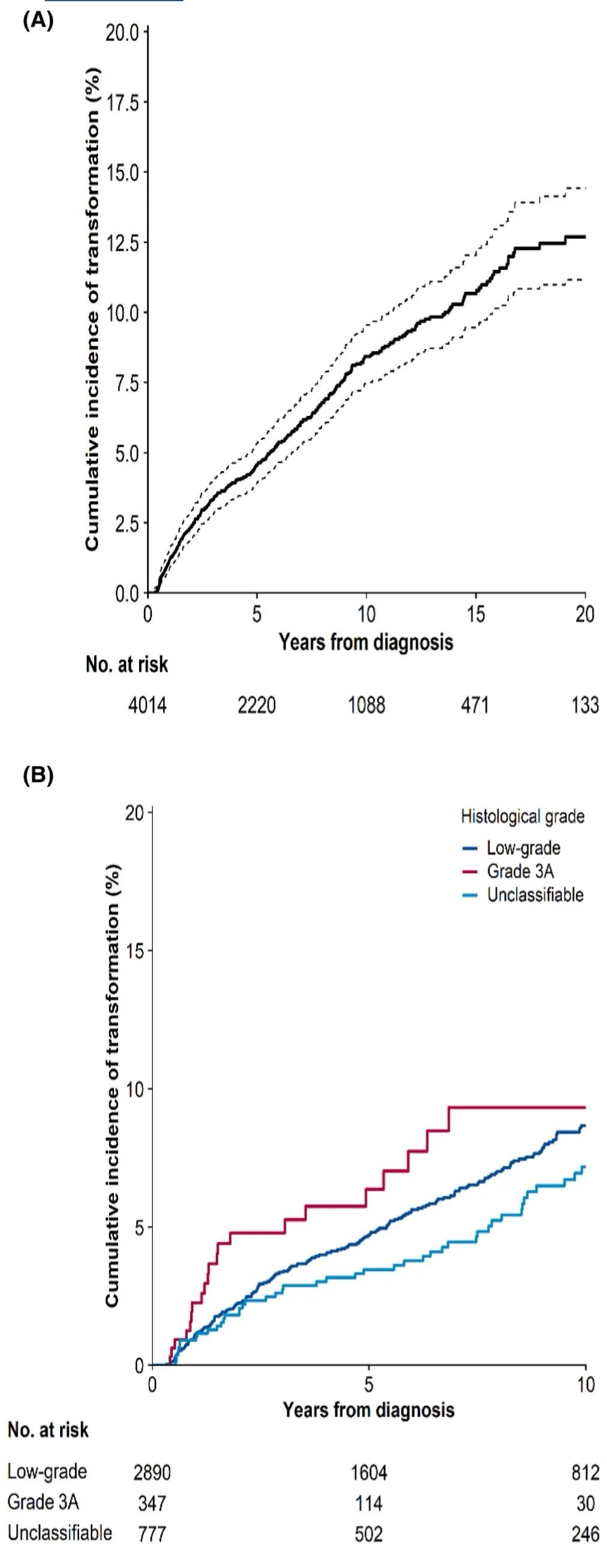| 芬兰癌症登记处(FCR)1995–2018年确诊的FL 1–3A级患者共4014例,排除3B级、复合淋巴瘤、尸检确诊或诊断不明确者。使用Kaplan-Meier方法估计总生存率(OS),Cox回归模型估计转化和死亡风险,Aalen-Johansen估计器计算转化的累积发生率,Ederer II方法估计RS。 患者特征:中位诊断年龄:64岁,女性占55%;分级分布包括低级别(1–2级)72%、3A级9%、未分级19%。中位随访8.9年。