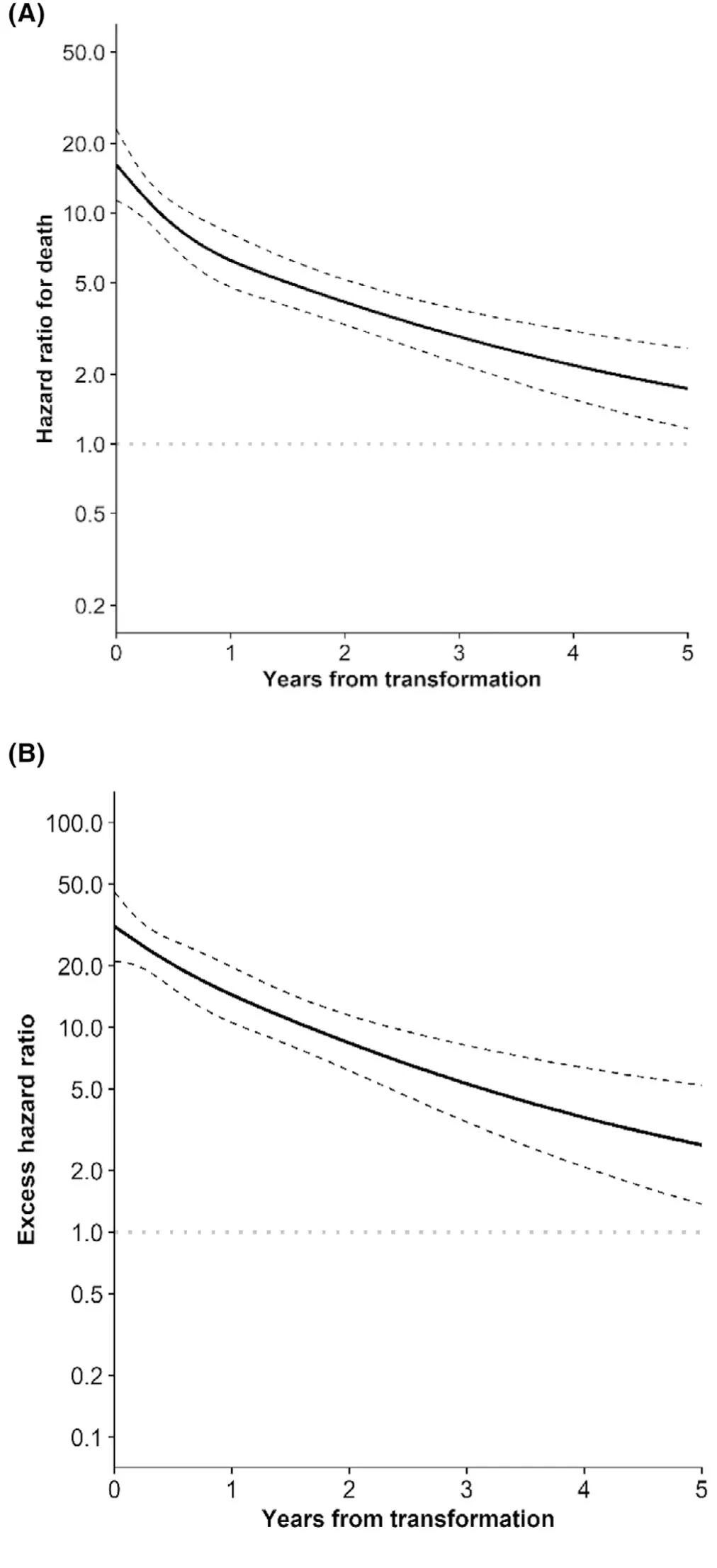 转化风险:10年累计转化发生率为 8.4%(5年为4.6%);3A级FL转化风险略高(5年6.4%,相对于低级别患者的4.7%),但无统计学显著差异。年龄每增加10岁,转化风险显著升高(HR=1.19);性别、诊断年份与转化风险无显著关联。各时期(1995 - 2002 年、2003 - 2008 年和 2009 - 2013 年)的 5 年累计转化率均保持在约 3%-4%,且将较晚诊断时期与较早诊断时期进行比较的校正特定原因风险比无统计学意义,表明早期转化风险无长期变化趋势。
