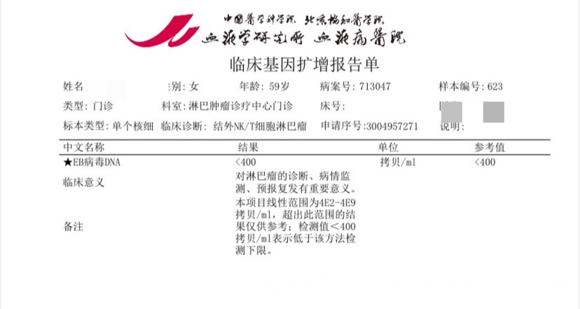 老妈23年8月确诊nkt,23年10月20日中期petCR,23年10月底第四次化疗结疗,23年12月25日至24年1月25日放疗结疗,结疗后5个月发现eb复阳(除了eb其余指标都很正常),血浆阴,单个核阳,分选nk阳性,每几个月复查一次,一直未转阴,虽然载量不高,但是始终提心吊胆!